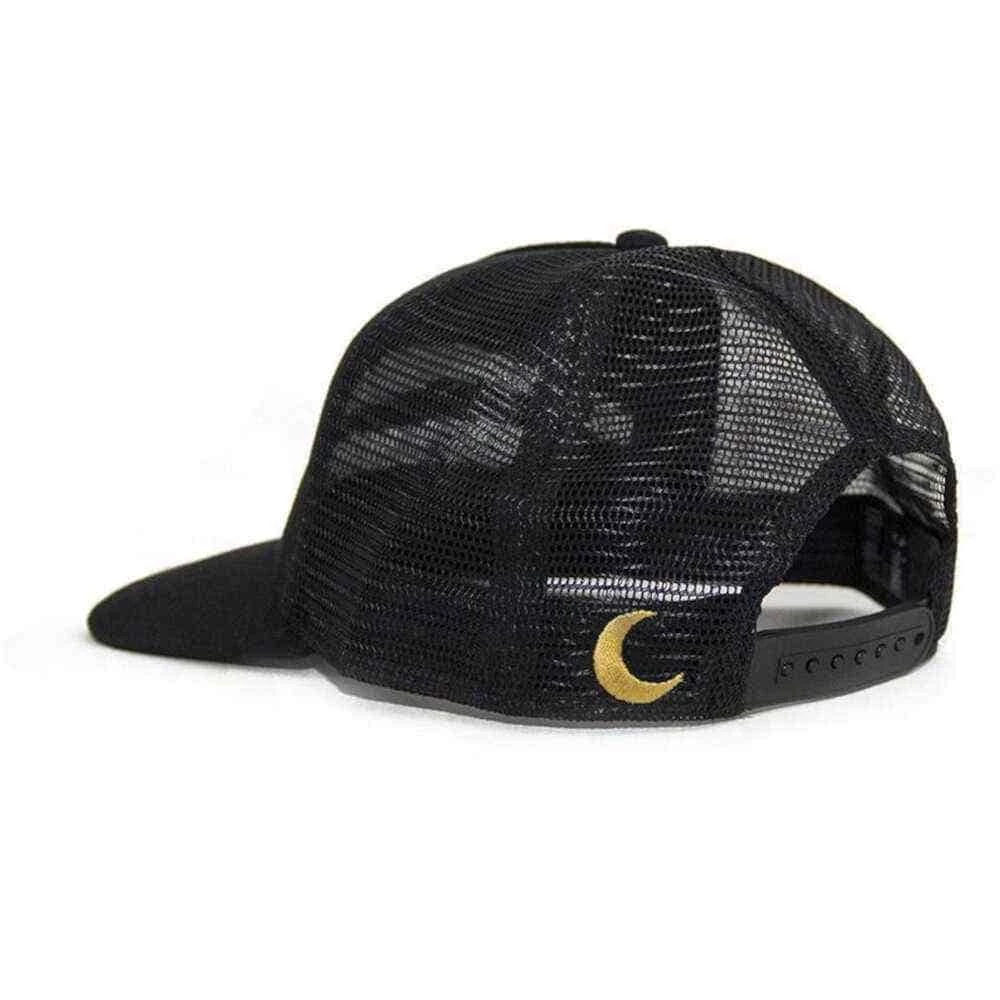 The low profile five panel trucker cap is made from cotton twill and with mesh sides. Embroidered front logo and a gold crescent moon next to the snap back. The perfect solution once the helmet comes off.